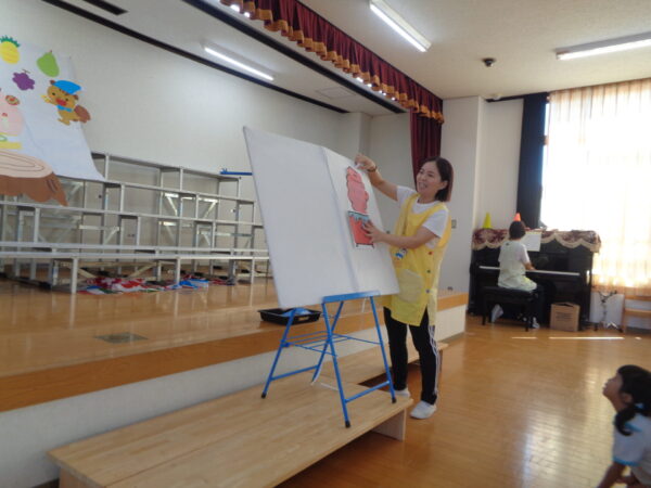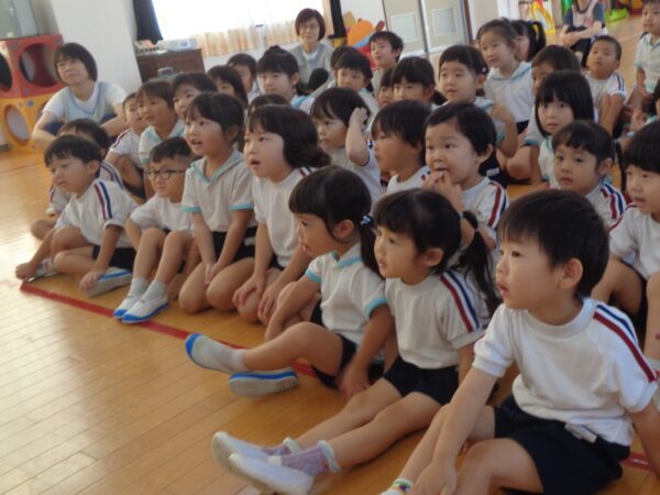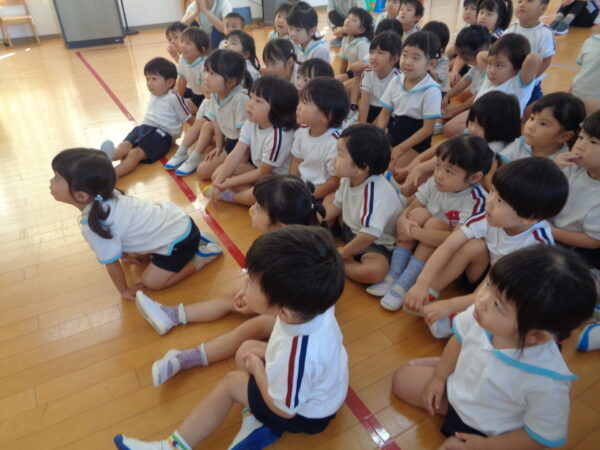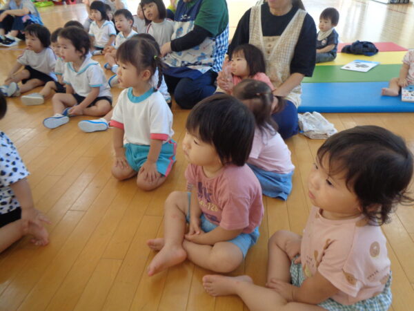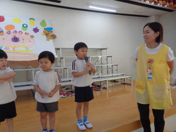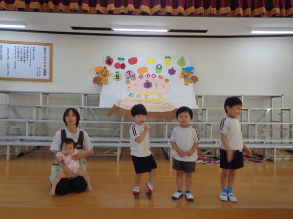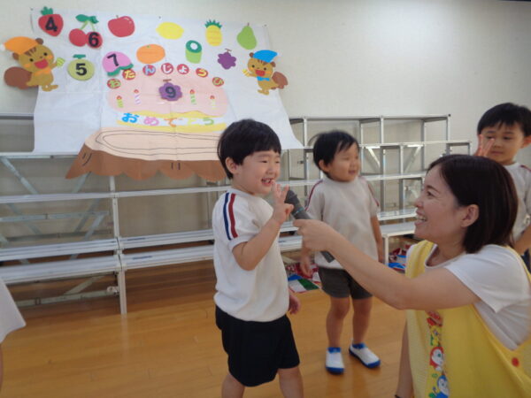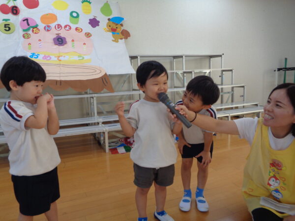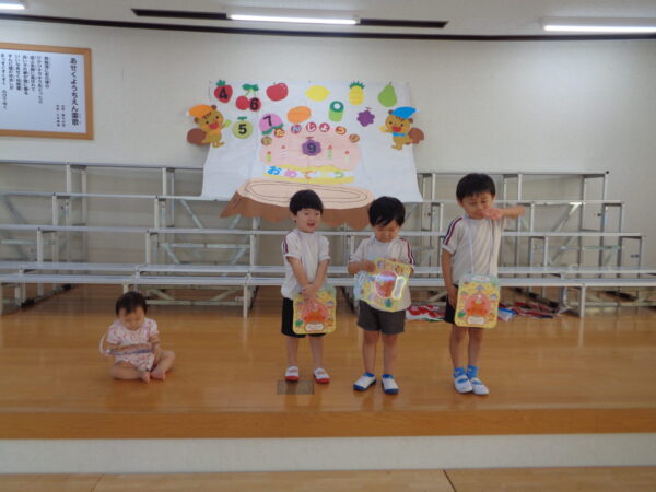 9月16日は9月生まれさんのお誕生日会でした。 みんな元気いっぱいインタビューに答えてくれましたよ。 好きな食べ物…マスカット、いちご 好きな遊び…ラキュー、レゴ、ブロック、ぽっとんおとし 大きくなったら…くるま、ケーキやさん 先生からの出し物はパネルシアター『おばけちゃんのだいぼうけん』でした。 おやつはチョコロールケーキでした。 9月生まれさんおめでとう🎉